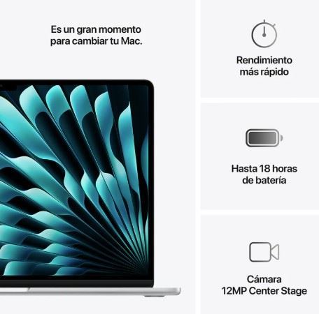 Descubre el poder y elegancia del MacBook Air de 15 pulgadas en color plata, equipado con el potente chip M4 de Apple, que integra una CPU y GPU de 10 núcleos junto a un Neural Engine de 16 núcleos, ideal para tareas exigentes y creativas. Su memoria unificada de 24 GB y almacenamiento SSD de 512 GB garantizan velocidad y eficiencia en todo momento. Disfruta de una experiencia visual envolvente con la pantalla Liquid Retina de 15.3” con True Tone. Incorpora Magic Keyboard retroiluminado con Touch ID, cámara frontal de 12MP con Center Stage y carga mediante puerto MagSafe 3. Cuenta con dos puertos Thunderbolt 4 y un adaptador de corriente de 35 W con doble USB-C. Incluye teclado en español (Latinoamérica) y garantía de 1 año. Tecnología y diseño que elevan tu productividad. ÚLTIMAS UNIDADES.